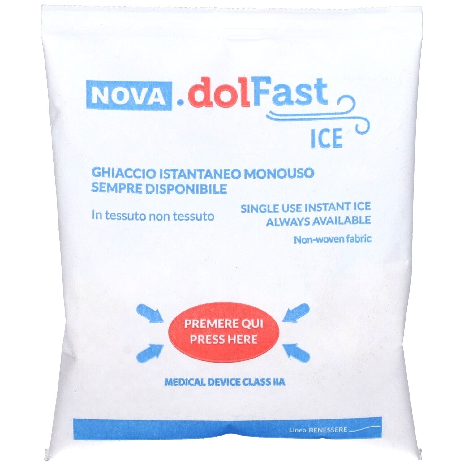 Modo d'uso: Premere con entrambe le mani verso il centro fino ad ottenere la rottura della bolla interna, agitare il sacchetto e applicarlo sulla parte interessata.