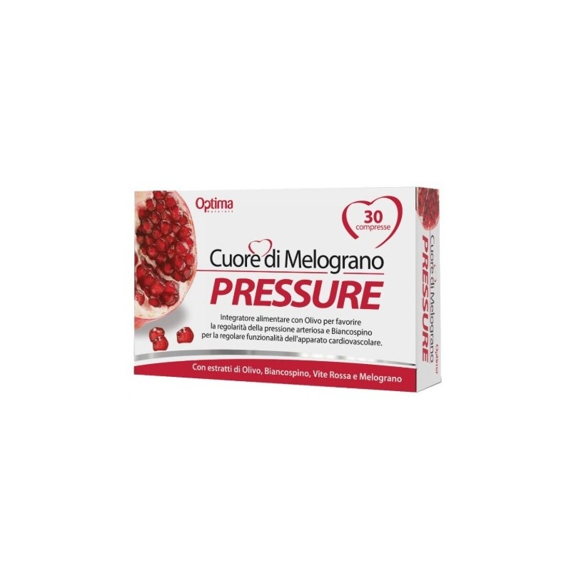 Cuore di Melograno Pressure di Optima Naturals è un integratore alimentare in compresse a base di estratti titolati di Melograno, Vite Rossa, Biancospino e Olivo. Il Biancospino regola la funzionalità dell'apparato cardiovascolare. L'Olivo favorisce la regolarità della pressione arteriosa.