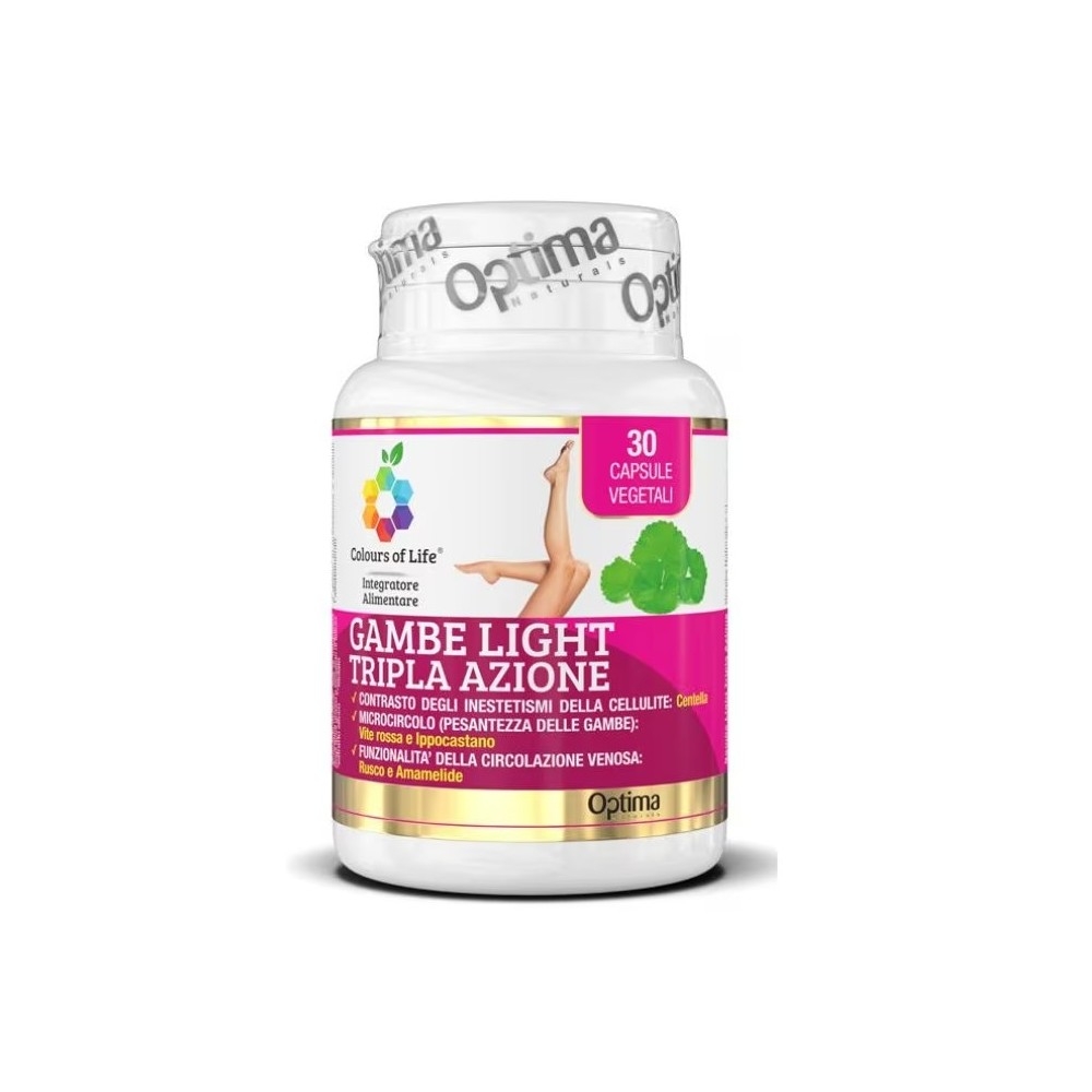 GAMBE LIGHT TRIPLA AZIONE è un integratore alimentare in capsule vegetali a base di estratti secchi, standardizzati e titolati, di Vite rossa, Centella asiatica, Rusco, Ippocastano e Amamelide. La Centella asiatica contribuisce a contrastare gli inestetismi della cellulite, la Vite Rossa e Ippocastano per la funzionalità del microcircolo e Rusco e Amamelide per la funzionalità della circolazione venosa.