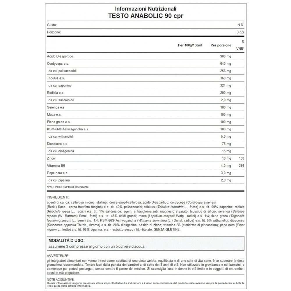 Ingredienti: Agenti di carica: cellulosa microcristallina, idrossi-propil- cellulosa; acido D-aspartico; cordyceps (Cordyceps sinensis (Berk.) Sacc., corpo fruttifero fungino) e.s. tit. 40% polisaccaridi; tribulus (Tribulus terrestris L., frutto) e.s. tit. 90% saponine; rodiola (Rhodiola rosea L., radici) e.s. tit. 1% salidroside; agenti antiagglomeranti: magnesio stearato, biossido di silicio; serenoa (Serenoa repens (W. Bartram) Small, frutti) e.s. tit. 45% acidi grassi; maca (Lepidium meyenii Walp., radici) e.s. 1:4; fieno greco (Trigonella foenum-graecum L., semi) e.s. 1:4; KSM-66® Ashwagandha (Withania somnifera (L.) Dunal, radice) e.s. tit. 5% withanolidi; dioscorea (Dioscorea opposita Thunb., rizoma) e.s. tit. 20% diosgenina; ossido di zinco; vitamina B6 (cloridrato di piridossina); pepe nero (Piper nigrum L., frutto) e.s. tit. 95% piperina. e.s.= estratto secco / tit.=titolato.