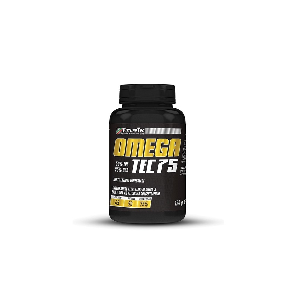 OMEGA TEC 75 è un integratore alimentare di acidi grassi essenziali omega 3 EPA e DHA ad altissima concentrazione (75%), in forma di trigliceridi. La forma di trigliceride è quella naturalmente contenuta nell’olio di pesce. La purificazione e concentrazione di questo olio avviene tramite il processo di distillazione molecolare, una tecnica che garantisce la massima purezza, inoltre gli acidi grassi non vengono alterati in alcun modo mantenendo così la loro naturale efficacia. 2 capsule = 1 porzione del prodotto contribuiscono al mantenimento della normale funzione cardiaca 1 (EPA e DHA) (l’effetto benefico si ottiene con l’assunzione giornaliera di 250 mg di EPA e di DHA), della normale funzione cerebrale (DHA) e della normale funzione visiva (DHA) (l’effetto benefico si ottiene con l’assunzione giornaliera di 250 mg di DHA).