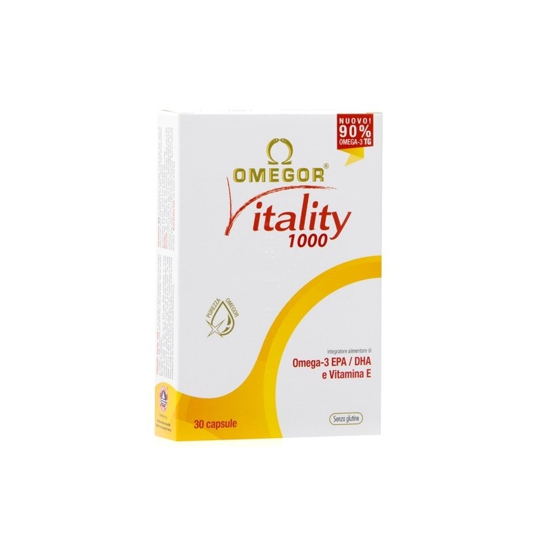 OMEGOR® Vitality 1000 da 30 cps è un integratore di omega-3 EPA e DHA e vitamina E. Come pochissimi altri prodotti al mondo, OMEGOR® Vitality 1000 ottiene su ogni lotto la certificazione 5 stelle IFOS (International Fish Oil Standards), prestigioso riconoscimento che attesta su ogni lotto commercializzato la concentrazione di principi attivi EPA e DHA, purezza e freschezza degli integratori Omega-3 di olio di pesce. E' un integratore alimentare di acidi grassi Omega-3 EPA e DHA da olio di pesce dei mari freddi, ottenuti per distillazione molecolare.
