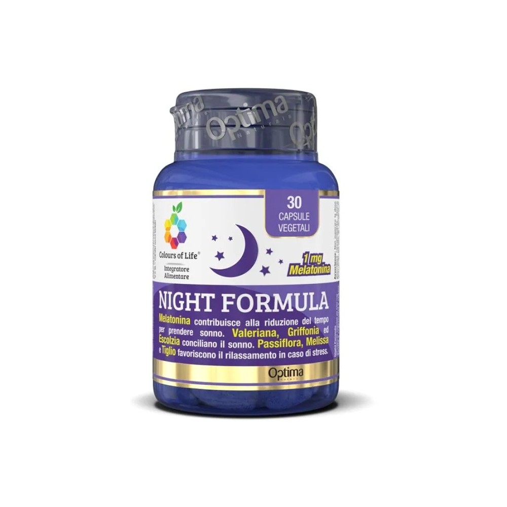 Night Formula è un integratore alimentare in capsule a base di estratti secchi, standardizzati e titolati, di Valeriana, Griffonia, Escolzia, Passiflora, Melissa, Tiglio. Con Melatonina e Vitamina B12.