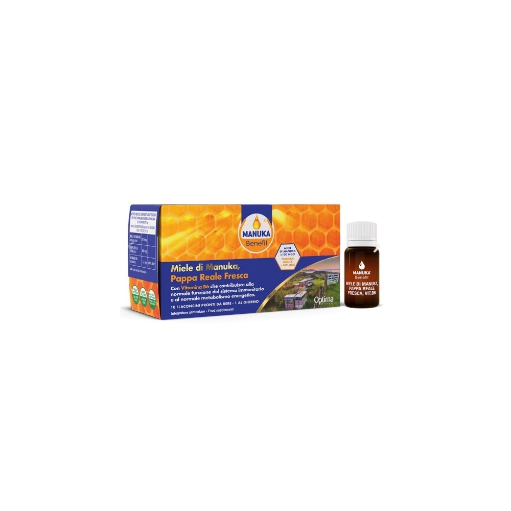 Integratore alimentare a base di Miele di Manuka. Con Pappa Reale fresca e Vitamina B6. L’insieme degli ingredienti funzionali rendono MANUKA Benefit ® Miele di Manuka, Pappa Reale fresca con Vitamina B6 adatto a contribuire alla normale funzione del sistema immunitario e al normale metabolismo energetico.