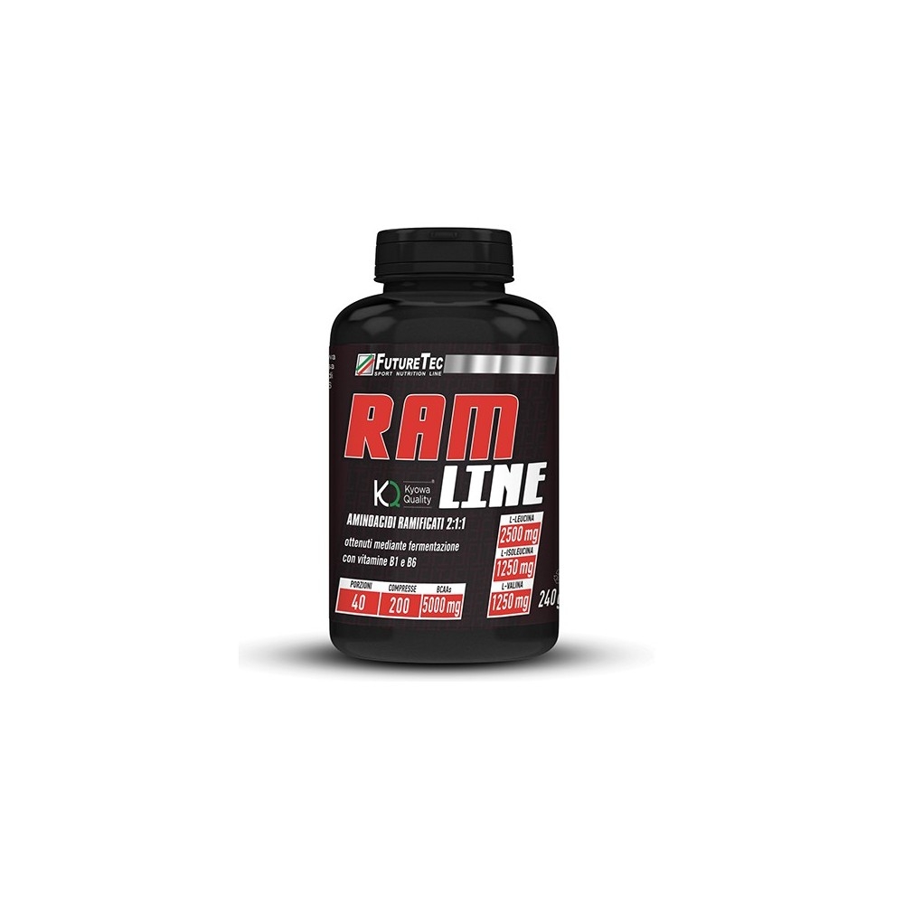 RAM LINE 2:1:1 è un integratore alimentare di aminoacidi a catena ramificata di qualità e purezza superiore garantita KYOWA QUALITY® ottenuti mediante fermentazione, con vitamine B1 e B6. I BCAA sono aminoacidi essenziali, l’organismo infatti non è in grado di sintetizzarli e devono pertanto essere assunti attraverso la dieta. RAM LINE è realizzato in compresse da 1000 mg nel classico rapporto 2:1:1 (2 parti di L-Leucina, 1 di L-Valina e 1 di L-Isoleucina).