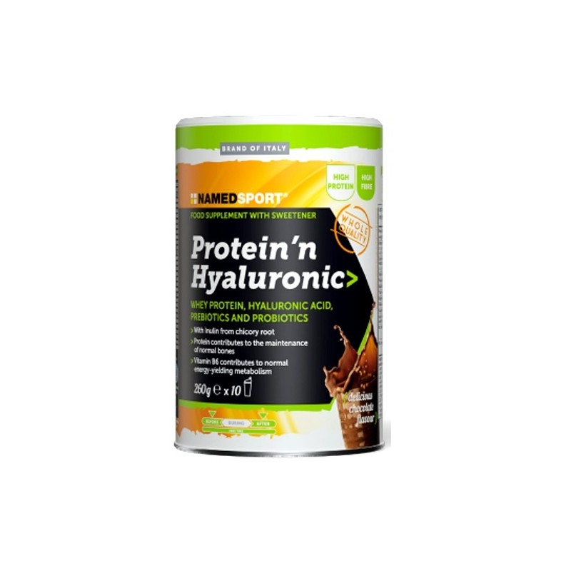 Protein 'n Hyaluronic è un supplemento innovativo e unico nel suo genere a base di proteine del siero del latte concentrate ed acido ialuronico, componente fondamentale dei tessuti connettivi dell’uomo. La speciale formulazione è arricchita da probiotici del genere Bacillus e da Inulina, un prebiotico naturale, importanti per l’equilibrio dell’ecosistema intestinale. L’aggiunta di Vitamine contribuisce al normale metabolismo energetico.