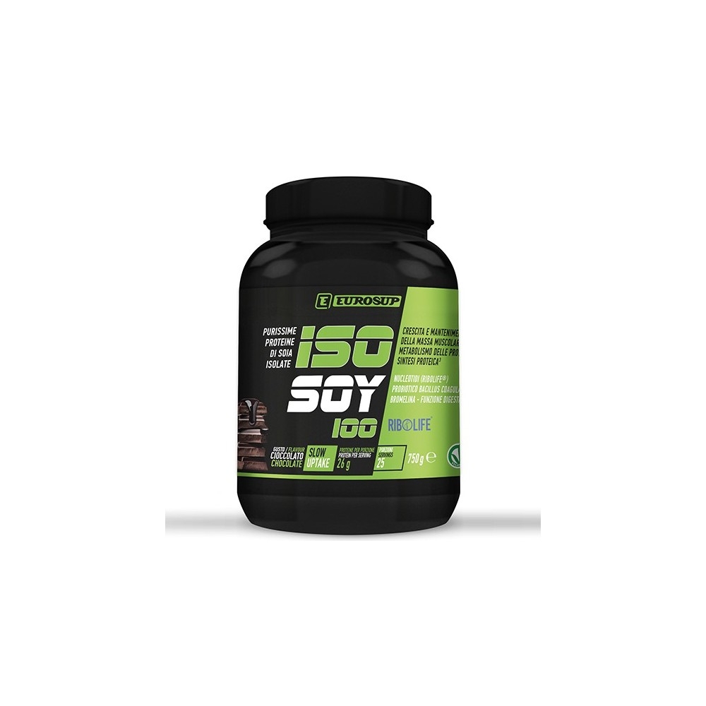 SO SOY 100 è un integratore alimentare di proteine isolate della soia a solubilità istantanea con edulcorante, da ricostituire a bevanda. Per questo integratore Eurosup ha scelto un isolato di proteine di soia della massima purezza e solubilità, che abbiamo attentamente aromatizzato per ottenere un prodotto dall’ottimo gusto. Questo prodotto contiene solo aminoacidi essenziali e non essenziali naturalmente contenuti nelle proteine della soia. Nessun aminoacido essenziale o non essenziale aggiunto in questa formula, l’apporto aminoacidico è quello naturale e quindi il valore biologico delle proteine delle proteine di soia è garantito, le proteine della soia sono infatti una fonte proteica di buon valore biologico. I tempi di digestione di queste proteine sono lenti, quindi il rilascio degli aminoacidi contenuti è graduale. La formula di ISO SOY 100 è stata sviluppata in modo specifico per gli sportivi. Le proteine contribuiscono alla crescita e al mantenimento della massa muscolare, la vitamina B6 contribuisce al normale metabolismo delle proteine e del glicogeno e alla riduzione della stanchezza e dell’affaticamento, lo zinco e il magnesio contribuiscono alla normale sintesi proteica, il folato contribuisce alla normale sintesi degli aminoacidi. ISO SOY 100 apporta la vitamina B12, vitamina del gruppo B di cui i vegani possono avere ridotti apporti dalla dieta. La vitamina B12 si trova infatti in alimenti di origine animale come carne, latticini e le uova e non in quantità significative in alimenti di origine vegetale. La vitamina B12 contribuisce alla riduzione di stanchezza ed affaticamento, al normale funzionamento del sistema nervoso e alla funzione del sistema immunitario. ISO SOY 100 è arricchito con bromelina da ananas, con funzione digestiva 4. ISO SOY 100 apporta inoltre nucleotidi (RIBOLIFE®) e Bacillus coagulans, un probiotico che favorisce l’equilibrio della flora intestinale. Bacillus coagulans è noto anche come Lactobacillus Sporogenes per la sua capacità di produrre spore e rimane inattivo fino alla colonizzazione intestinale, dove favorisce l’equilibrio dell’ecosistema intestinale, aumenta la digestione e l’assorbimento delle proteine e supporta il sistema immunitario.
