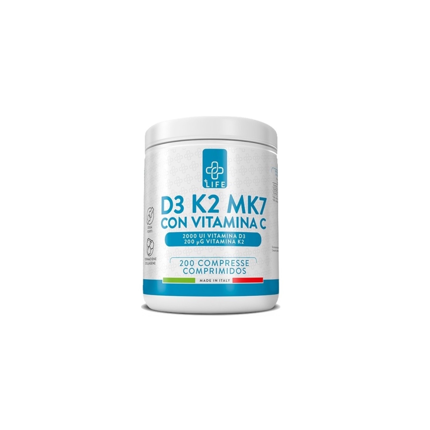 +Life D3 K2 MK7 Con Vitamina C è un integratore alimentare composto da vitamina D3, vitamina k2 ed aggiunta di vitamina C. La vitamina D3 sostiene l'assorbimento di adeguati livelli di calcio, mentre la vitamina k2, nella sua forma più biodisponibile Mk-7, concentra il trasporto di calcio proprio nelle ossa. Per questa ragione, se assunte contemporaneamente, aumentano considerevolmente i benefici per il nostro organismo. La formula +Life aggiunge inoltre la vitamina C per un'azione sinergica a sostegno del tuo sistema immunitario. Sia la vitamina d3 che la vitamina k2 sono indispensabili per il corretto assorbimento del calcio e promuovono la salute del nostro sistema scheletrico. La Vitamina C, oltre a supportare le difese immunitarie, contribuisce alla formazione del collagene per una maggiore salute delle tue ossa.